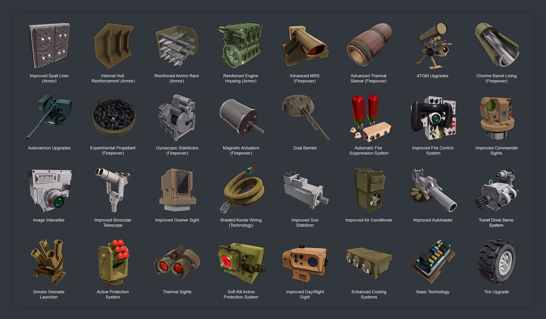 The process of generating these icons was pretty simple. Read about the item in confluence, try to find any reference imagery online or in one of our tank reference manuals, and then rebuild it in Max. These weren't intended to be 3D game assets, so I made overly complex meshes, skipped on textures, and added detail in Photoshop after the base renders were complete. This was a lot of fun to do. I think that makes me a nerd? Also, who knew tanks used so many different kinds of ammo?