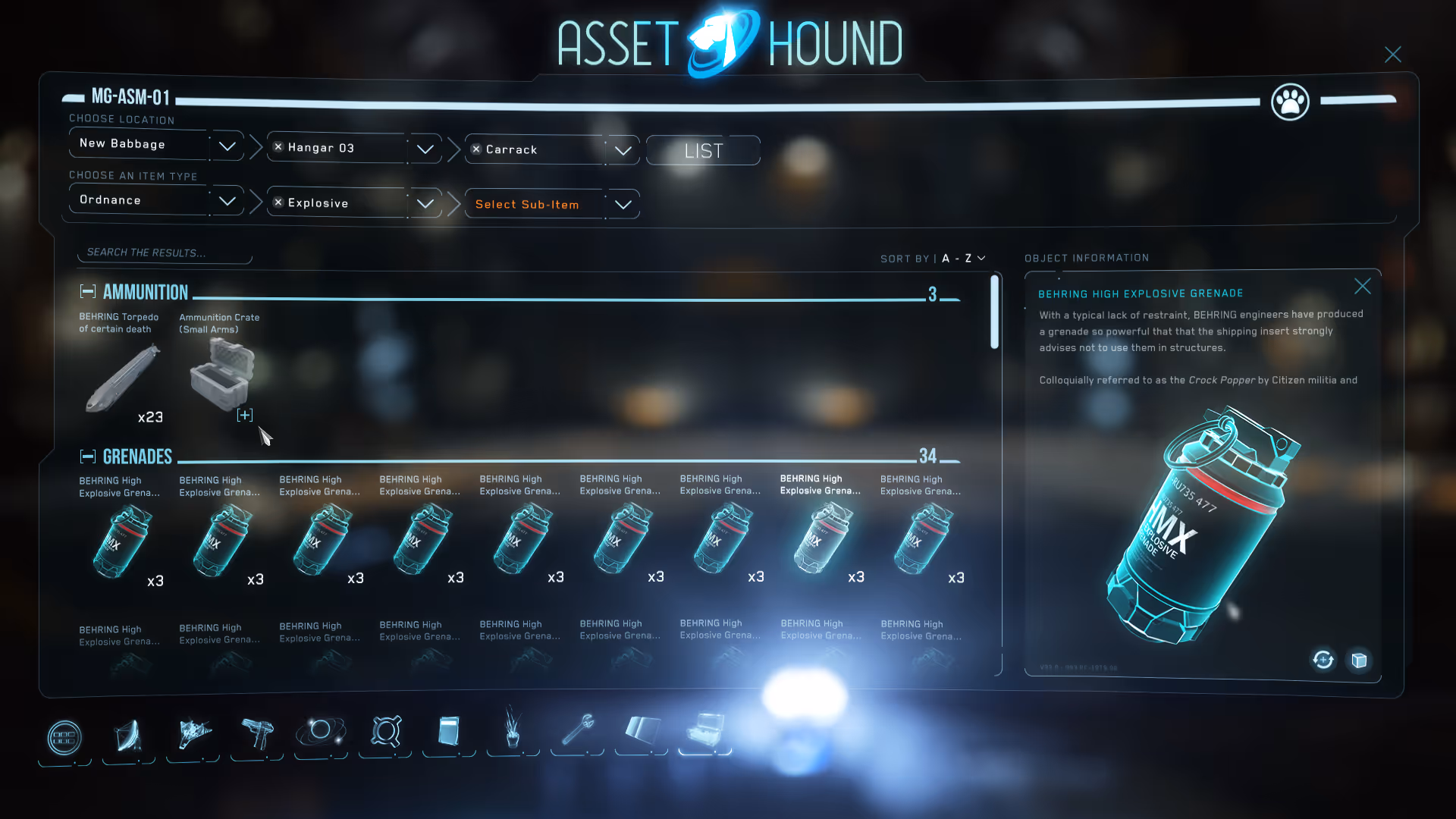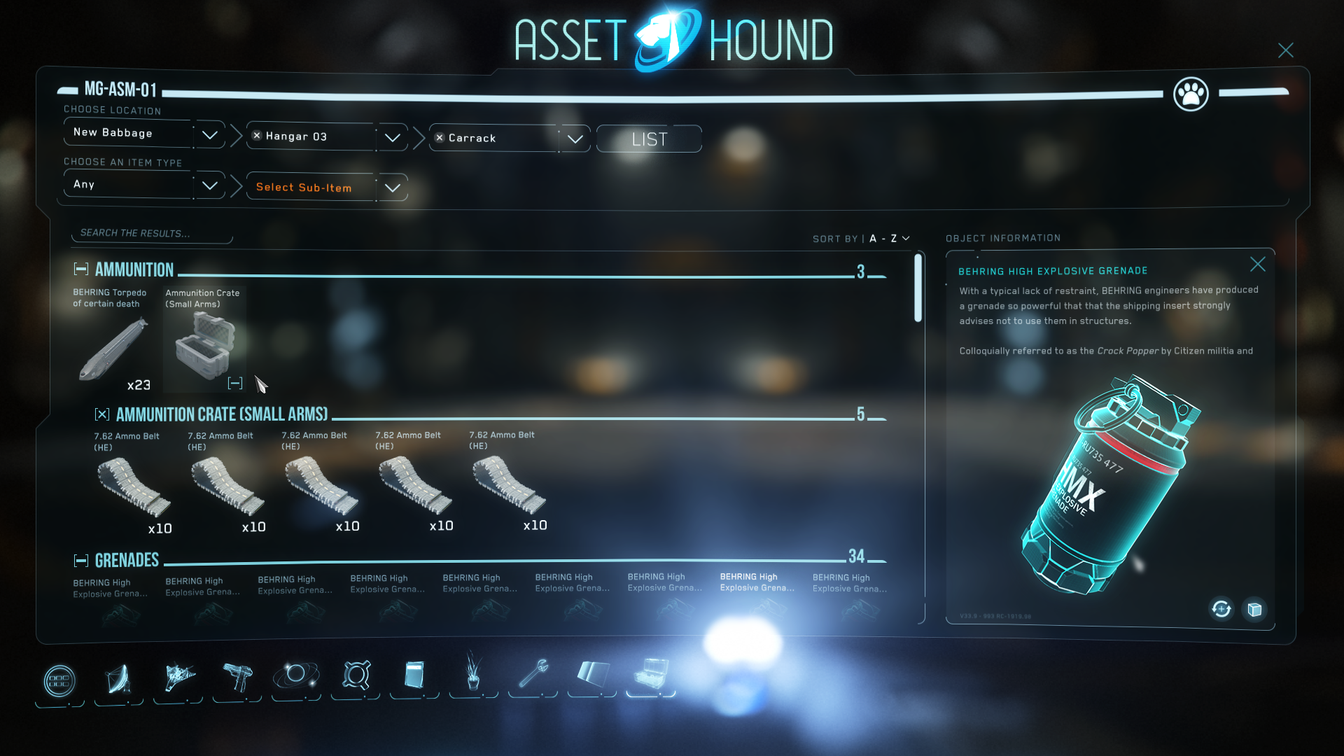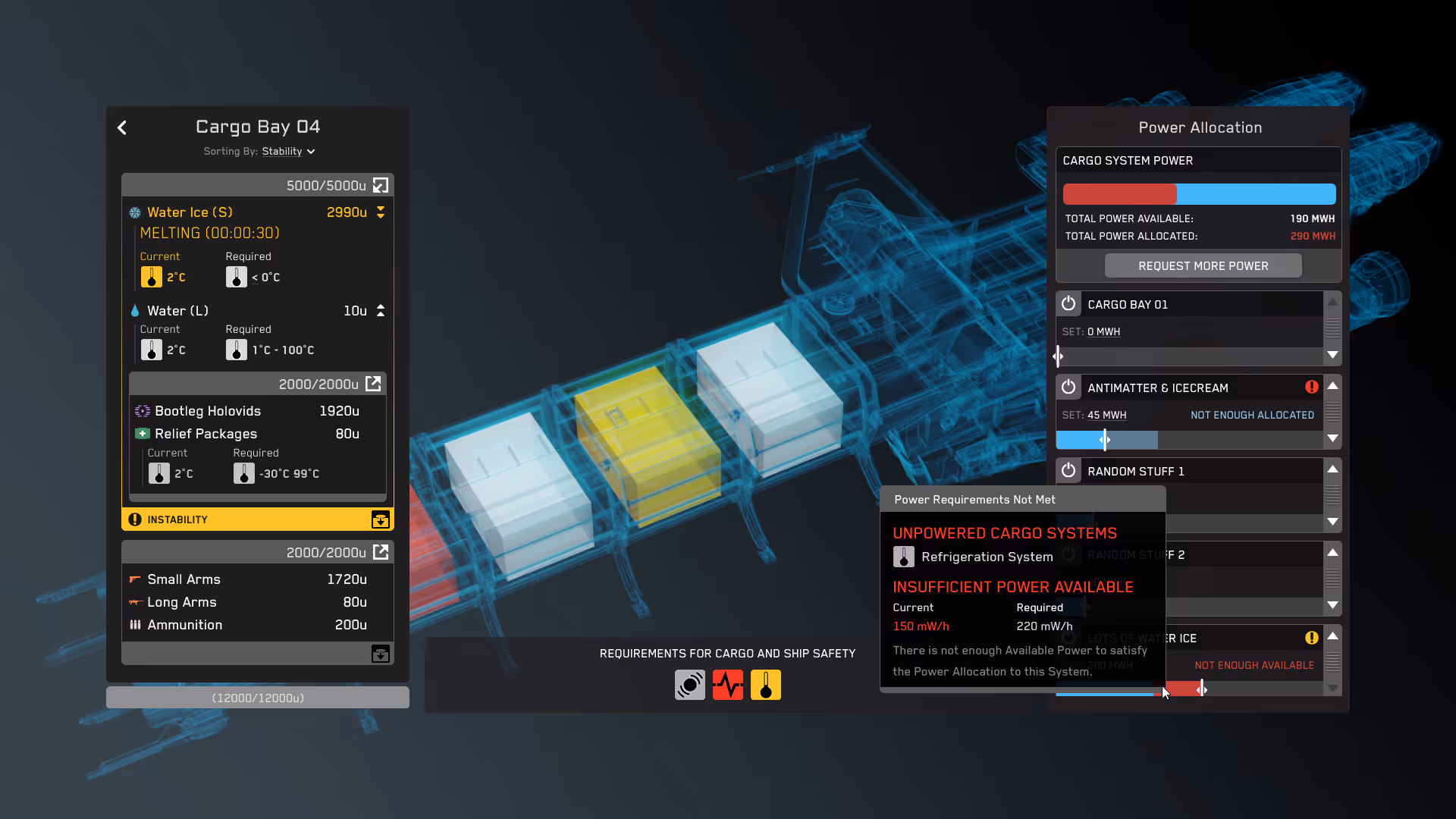 There was exploration regarding turning cargo itself into a gameplay opportunity. What if you had delicate goods, that required certain types of crates, or cargo holds? You'd need some way to have oversight of everything on your ship. With the ability to put any item in any crate, and crates into bigger crates, tracking the hierarchical location and status of everything was a challenge.