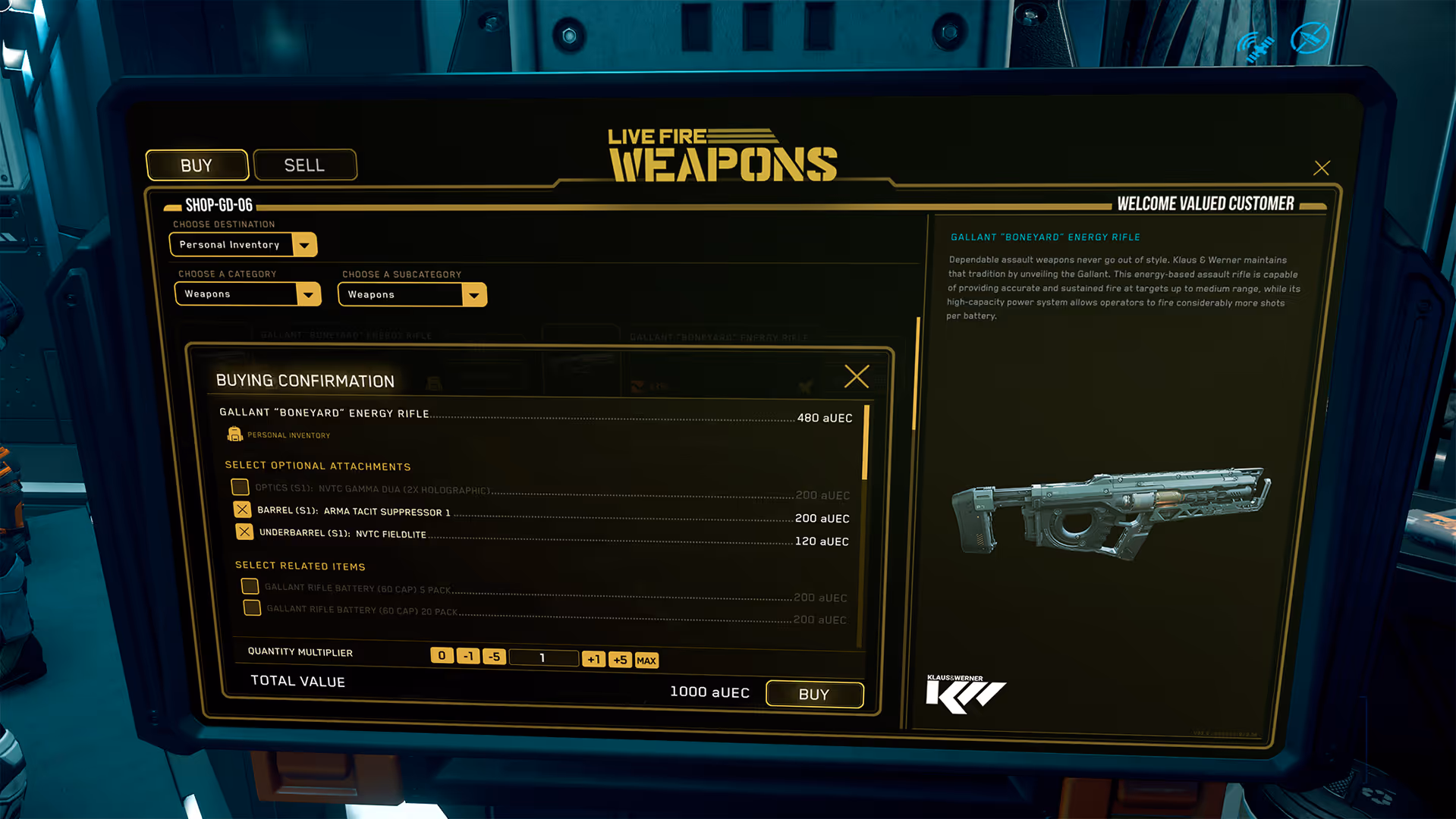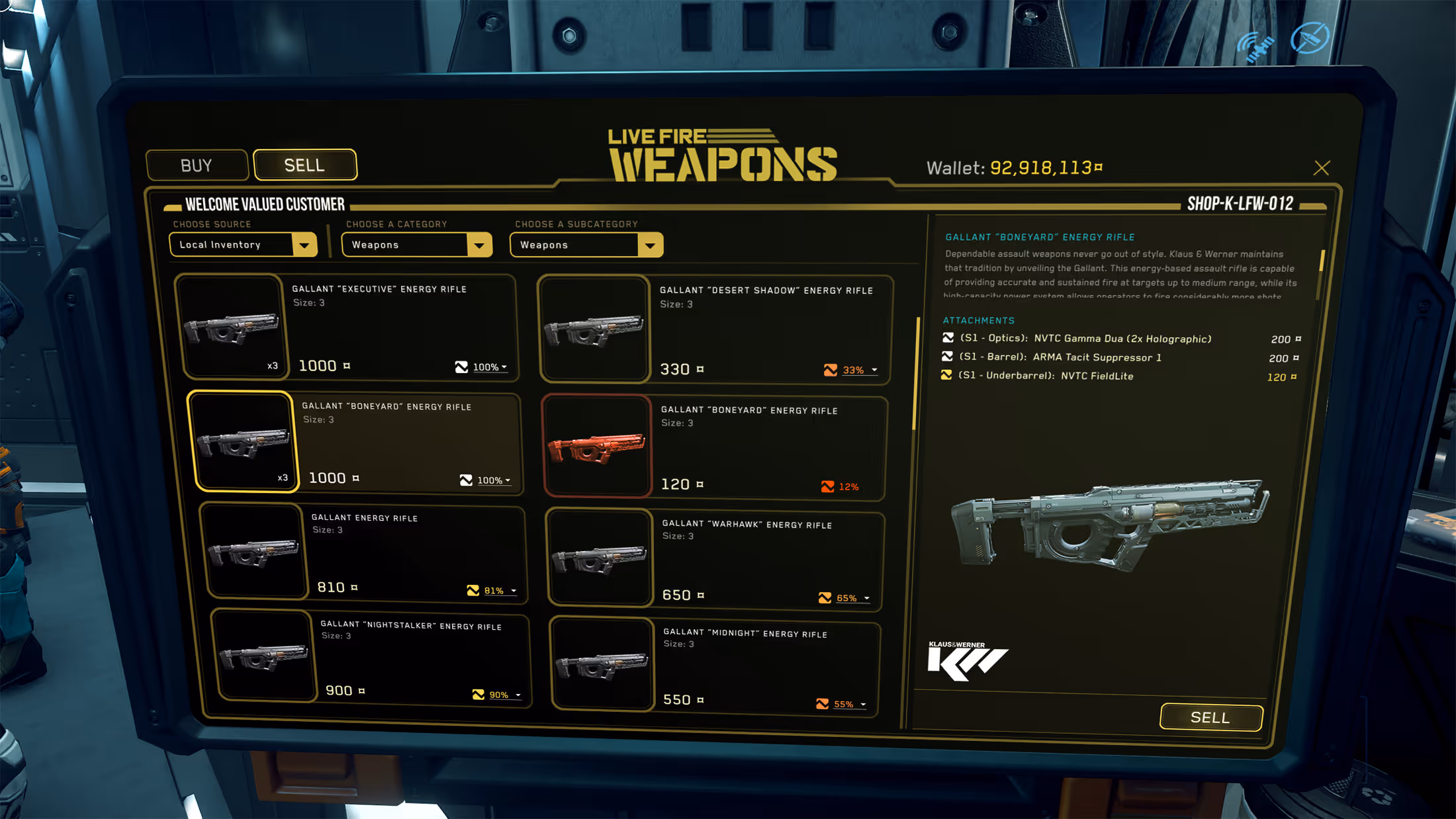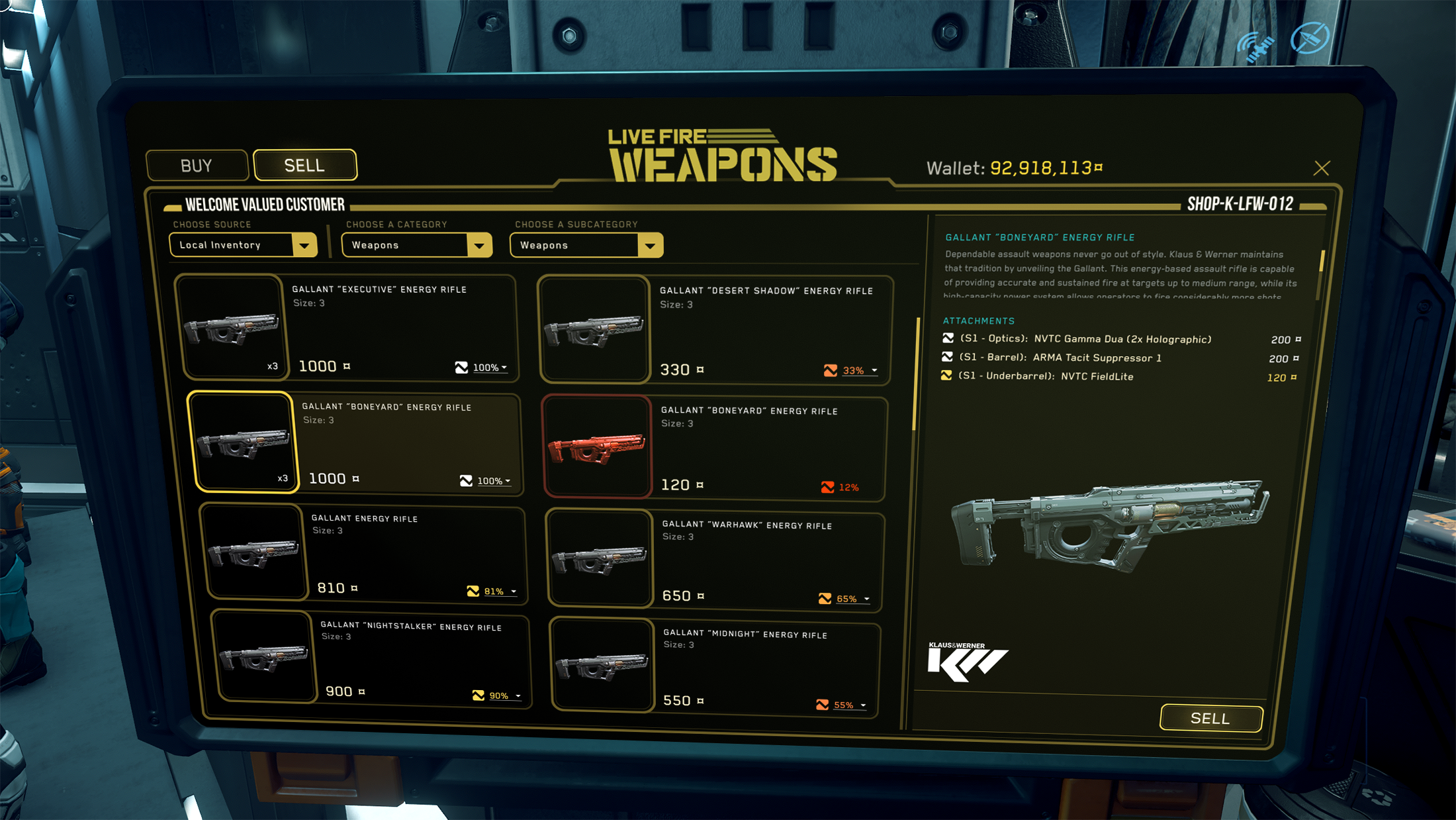 After a few cycles of iteration, we landed on this structure. I authored a neutrally-designed version of our base shop UI in our implementation tool, and utilized our style sheet system to design dozens of new, unique styles directly in the tool itself, to represent all the different store brands in the game universe. Every shop you see runs on the same bones.