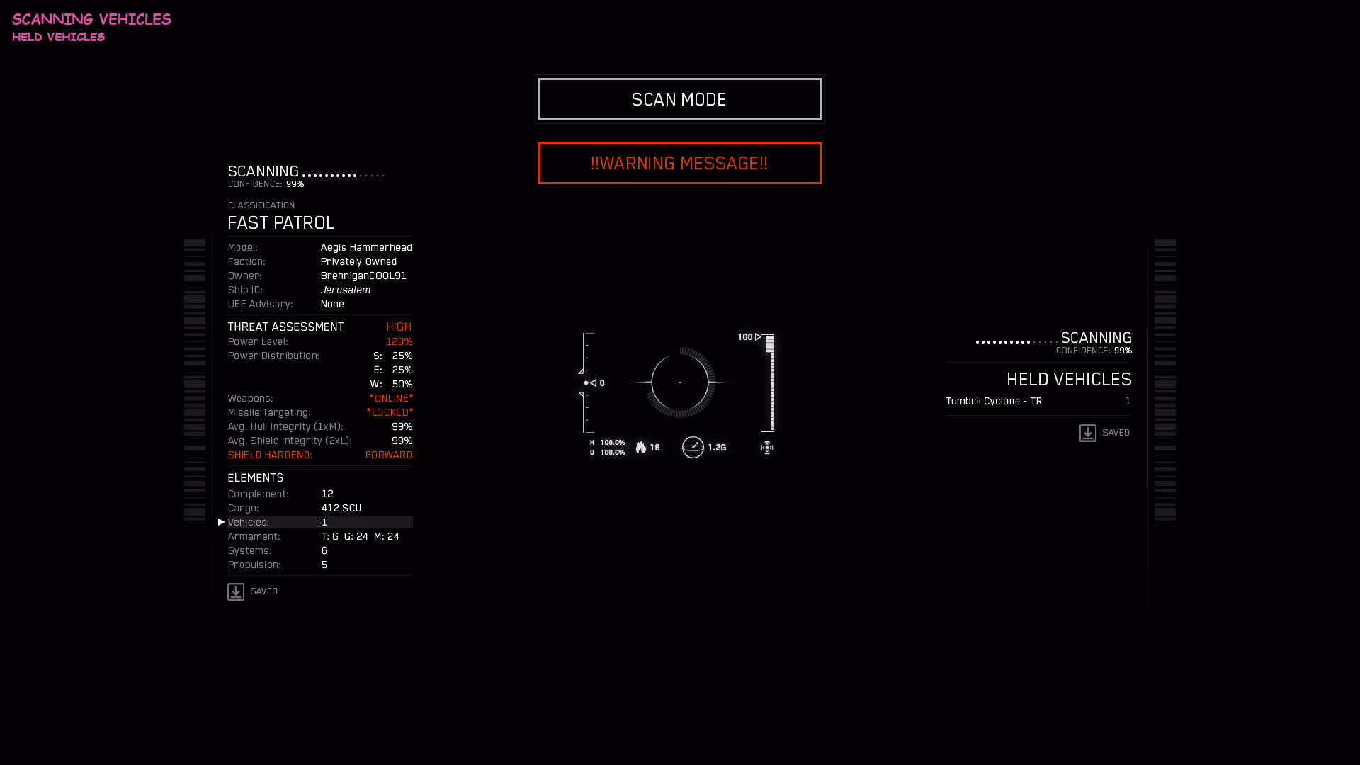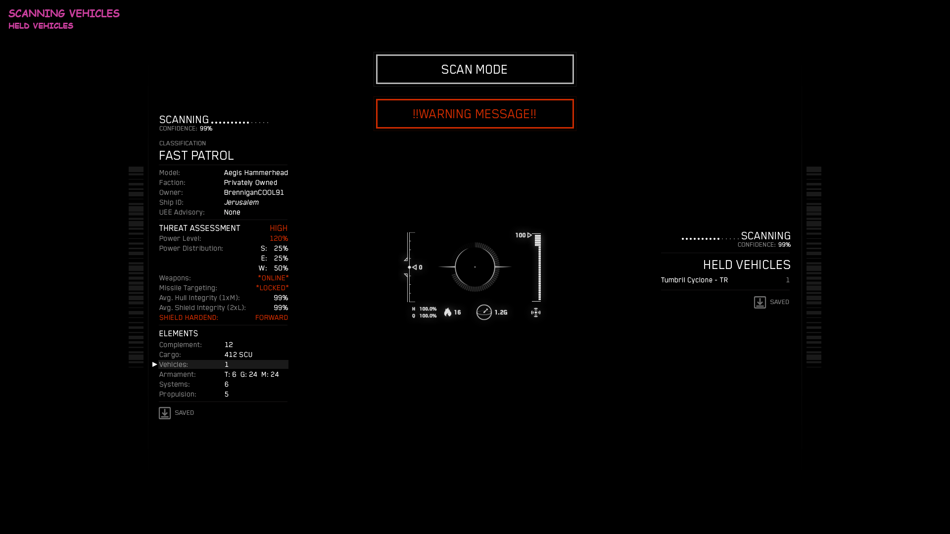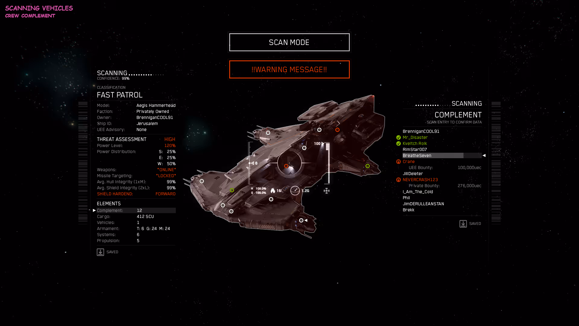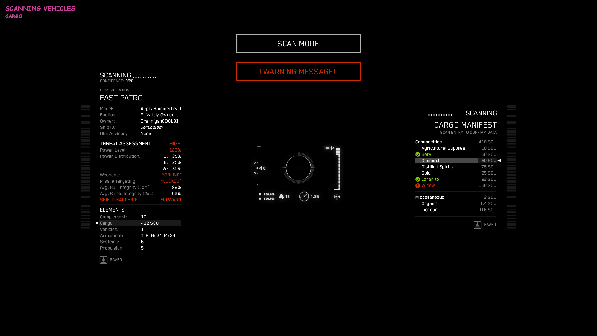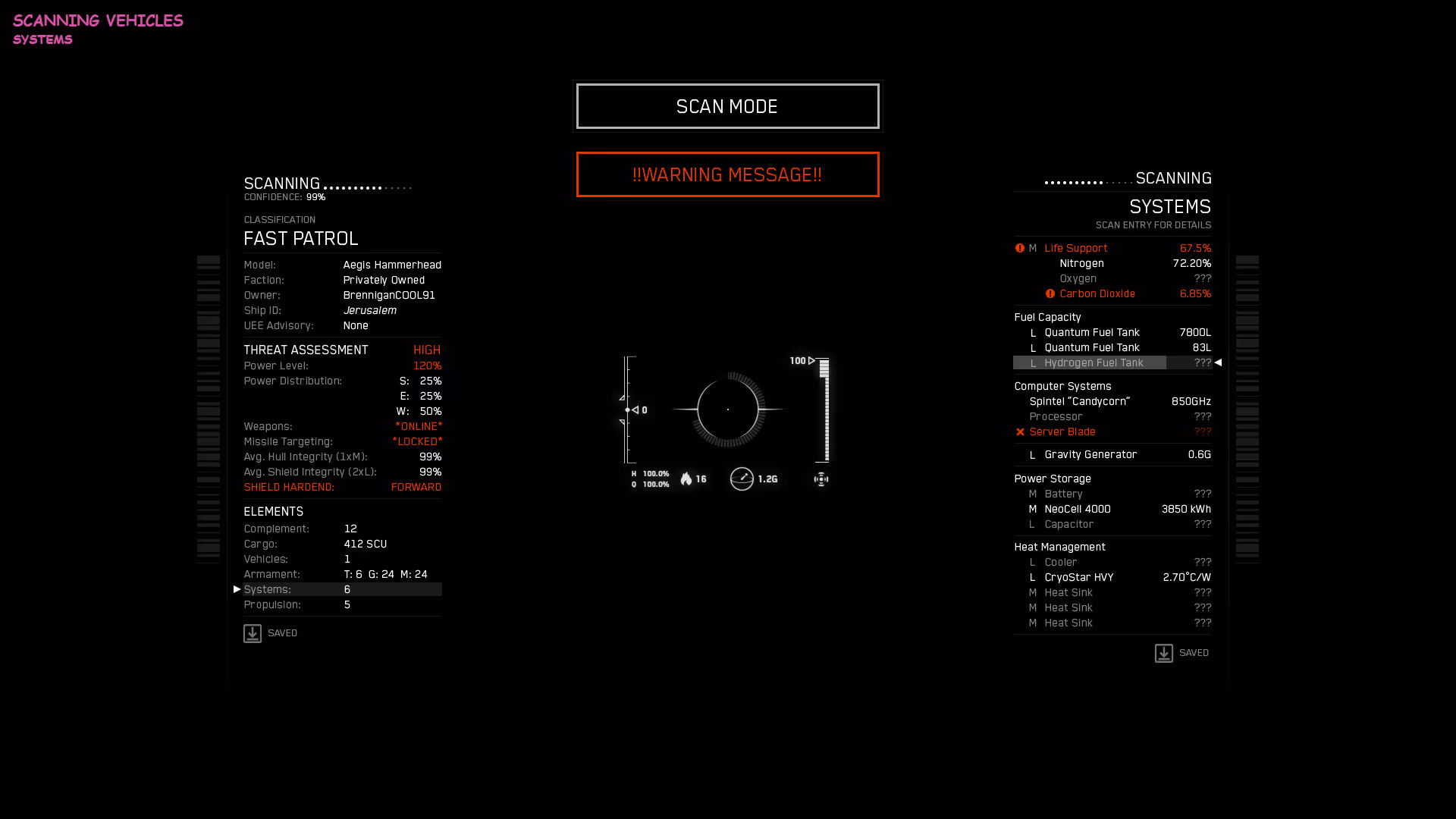 A task came in to help visualize a more robust form of scanning, to turn the simple button-press into a dedicated gameplay role on board a large class of ship. In this UI, the scanner can dig down and find detailed information about the ship, its equipment, and even the crew.